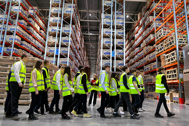 На АО ТК «Альфа» ребятам рассказали и показали, как организована работа комплекса. В частности, на предприятии внедрена технология голосового отбора. Она применяется для быстрой и безошибочной сборки товаров на высоконагруженных складах, без бумажных документов и терминалов сбора данных.