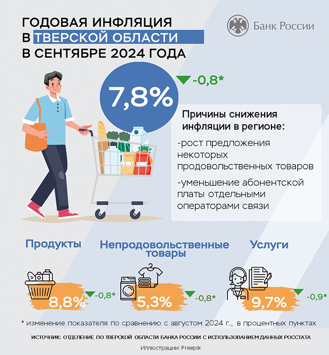 В сентябре 2023 года в Тверской области была зафиксирована годовая инфляция на уровне 7,8%, что является снижением по сравнению с 8,6% в августе. Это снижение инфляции стало позитивным сигналом для экономики региона, особенно учитывая, что уровень инфляции в Центральном федеральном округе составил 9,2%, а по России в целом - 8,6%.