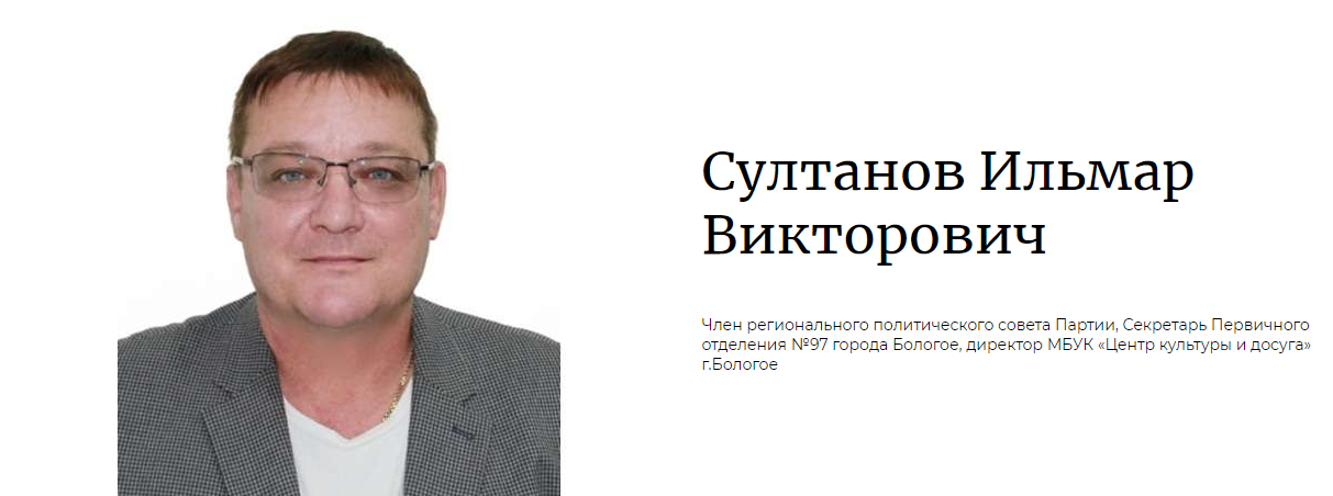 Как нам стало известно от анонимного источника, среди наиболее вероятных претендентов на этот пост в областных кулуарах рассматривается кандидатура Члена регионального политического совета Партии «Единая Россия», Секретаря Первичного отделения №97 города Бологое, директора МБУК «Центр культуры и досуга» Султанова Ильмара Викторовича, 05.11.1973 г.р.