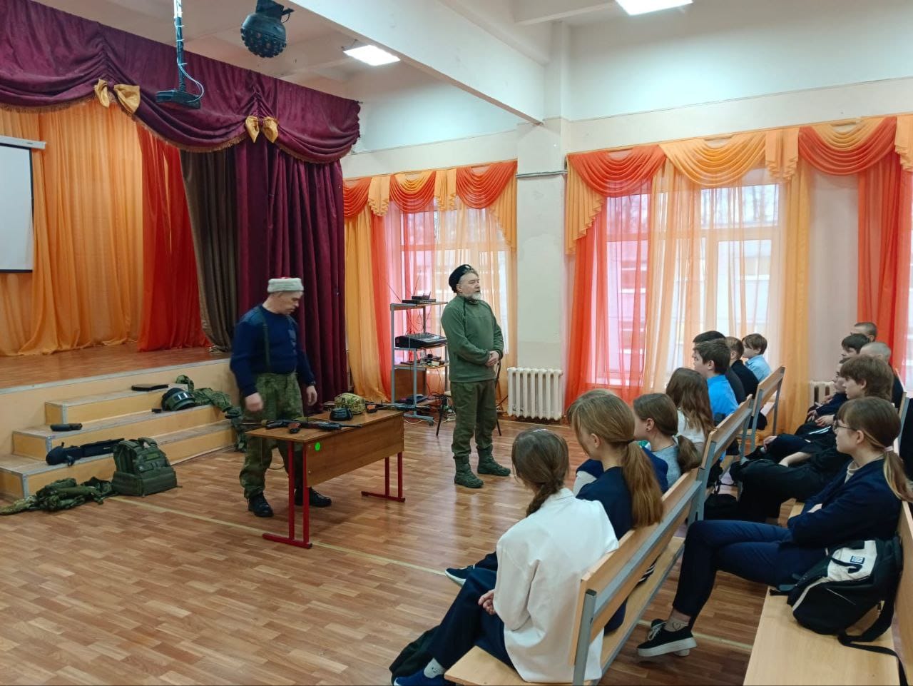 Член региональной Общественной палаты, атаман Тверского Отдельского Казачего общества Юрий Мякеньких и заместитель атамана Андрей Жильцов провели урок Мужества для учеников 5-11 классов верхневолжской школы деревни Рязаново Калининского муниципального округа.