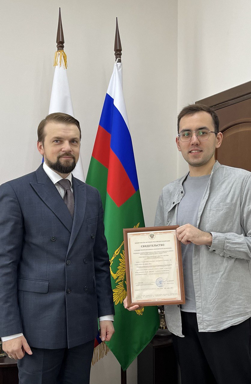 Начальник Управления Минюста России по Тверской области Евгений Орловский вручил свидетельство о государственной регистрации Регионального отделения Общероссийского общественно-государственного движения детей и молодёжи «Движение первых» Тверской области Председателю совета регионального отделения Движения Антону Гончугову.