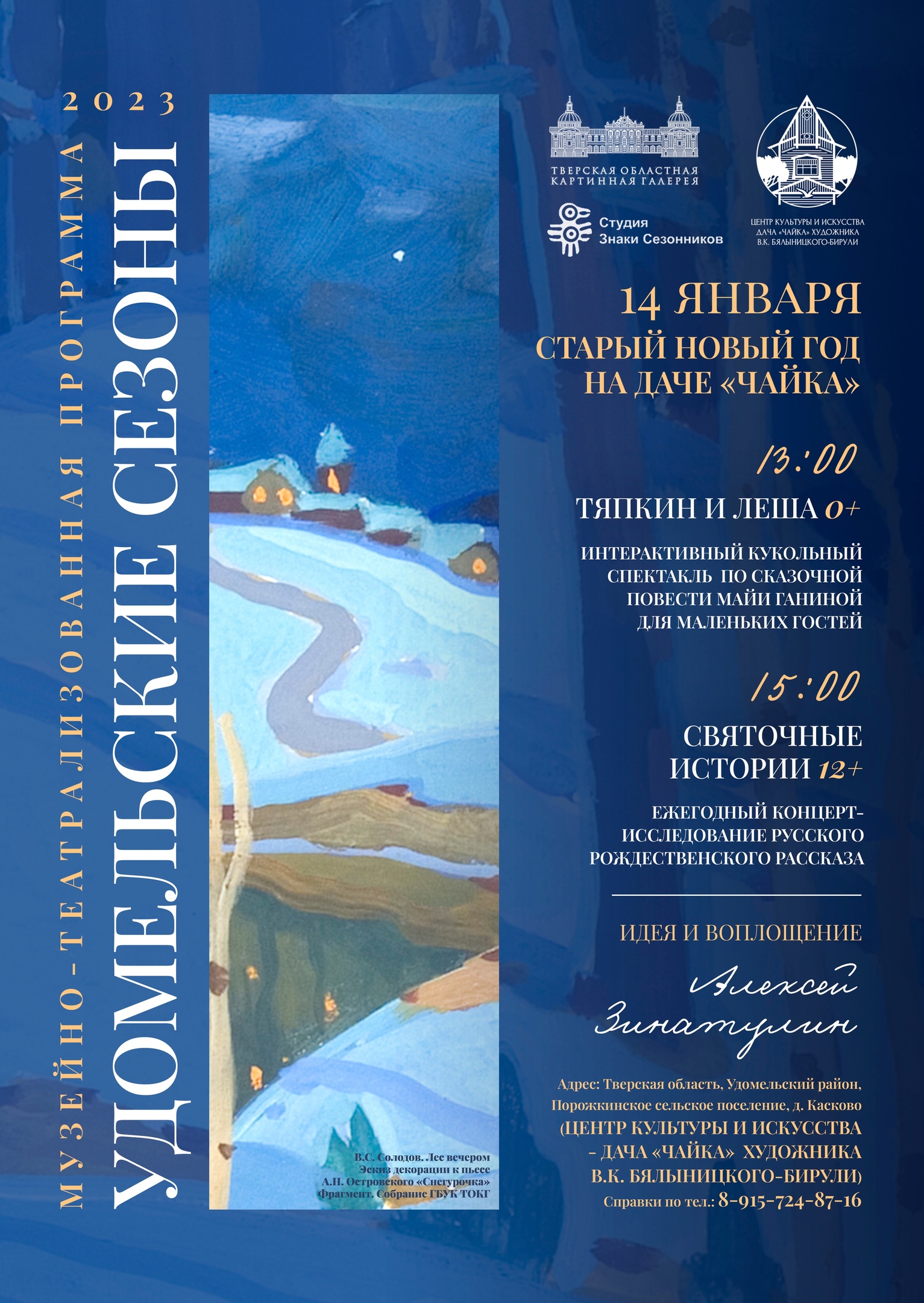 Друзья, в 14 января, в Старый Новый год, приглашаем на Дачу "ЧАЙКА" В.К. Бялыницкого-Бирули на музейно-театрализованную программу "Удомельские сезоны"! В 13.00 для маленьких гостей состоится интерактивный кукольный спектакль "Тяпкин и Леша" по сказочной повести Майи Ганиной, а в 15.00 - ежегодный концерт-исследование русского рождественского рассказа, в котором прозвучат как полюбившиеся театральные миниатюры, так и новые премьерные новеллы.