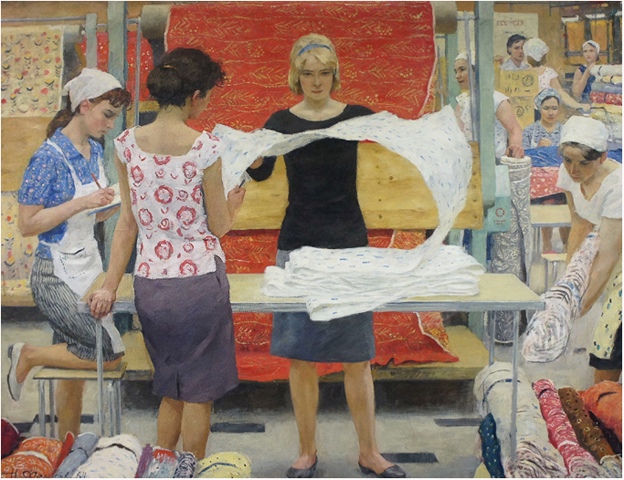 Одна из самых значительных работ мастера - картина «Отдел контроля», выполненная на Черемушкинском ткацком комбинате. Три девушки, изящные в своей естественной красоте, изображены во время работы. Их лица сосредоточены и внимательны. Художник выбирает эффектный момент: работница, проверяя качество продукции, взмахивает тканью, и полотно красиво взвивается в воздухе. Позади - обширное производственное помещение с людьми.