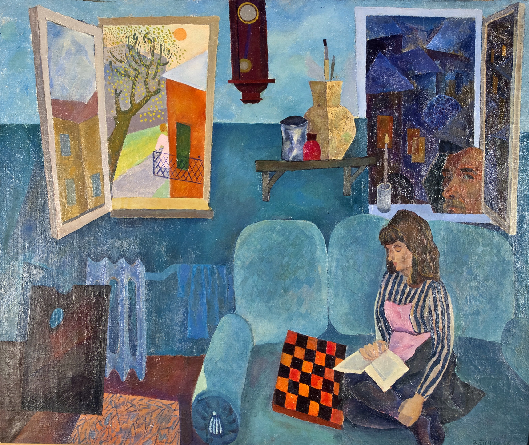 Глядя на картину, мы понимаем, что здесь царят свои законы, что здесь для художника остановилось время. Застыл маятник в больших настенных часах, а за окнами мастерской соседствуют день и ночь. Чередой перед нами проходят и атрибуты творчества художника: палитра, кисти, баночки с красками. На зеленом уютном диване его жена увлеченно читает книгу, погрузившись в свой мир переживаний. Тревожное чувство беспокойства вносят в картину изображение шахматной доски с яркими черно-оранжевыми квадратами и автопортрет в стиле Петрова-Водкина на осколке разбитого зеркала с острыми колкими краями: автопортрет-раздумье, автопортрет-размышление. Это отражение - вопреки всем законам перспективы - доминирует в окружающем пространстве.