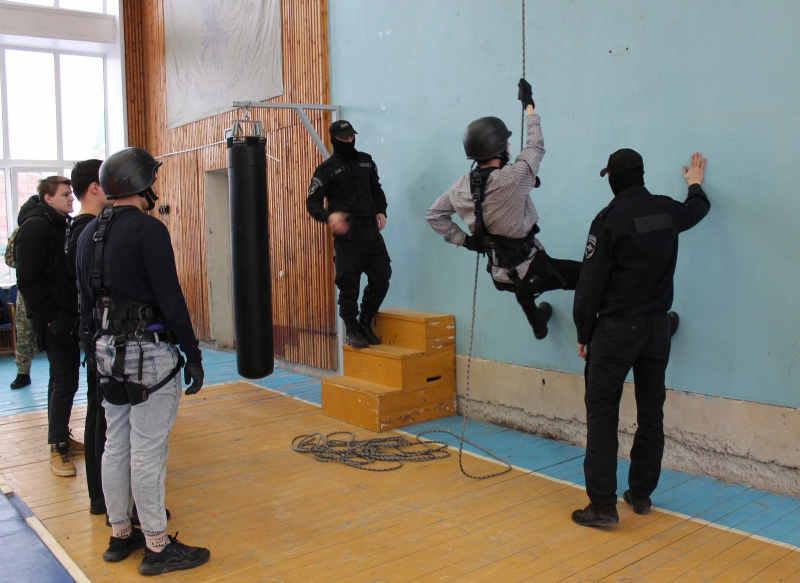 Студенты также взглянули на оружие, которое применяет «Гром», и подержали его в руках, посмотрели на технику и маскировочные средства. А в спортзале им показали, как спецназовцы штурмуют здание.