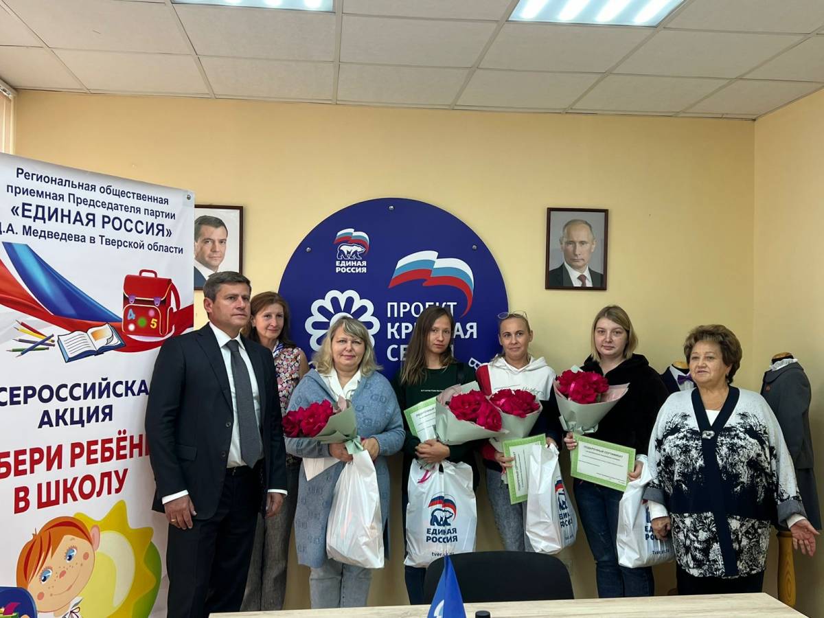 Руководитель Региональной общественной приёмной партии «Единая Россия» Лилия Корниенко совместно депутатом Законодательного Собрания Тверской области Максимом Сульманом вручили родителям школьников сертификаты на канцелярские принадлежности в рамках акции «Собери ребенка в школу».