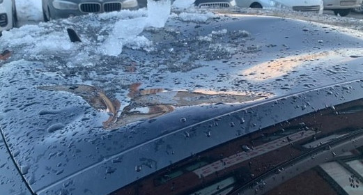 19 января в Торжке на улице Студенческая снег упал с крыши дома на припаркованный рядом легковой автомобиль и раздавил лобовое стекло и кузов.