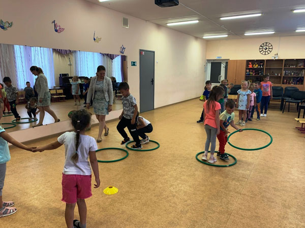 Ребята познакомились с биографией писателя, послушали его рассказ «Три котёнка» и ответили на вопросы по нему. А сказку «Под грибом» даже инсценировали, разыграв историю по ролям. Все вместе размялись, словно кошки, а потом в форме ритмического задания изобразили дождь. Да так здорово изобразили, что по залу растеклась воображаемая река, и ребята переправлялись через неё с помощью обручей.