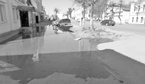 Те, кто часто ходит и ездит по Б. Спасской, хорошо знают большую лужу почти напротив ДК «Железнодорожник», которая в дожди образуется на дороге, тротуаре и даже заливает дверные проёмы дома.