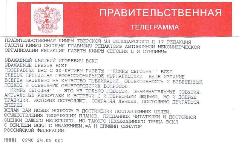 Со страниц главной региональной газеты «Тверские ведомости» я хочу поблагодарить всех причастных к юбилею «Кимры Сегодня»: учредителей, сотрудников редакции и внештатных корреспондентов, информационных партнеров и рекламодателей. Но в первую очередь от лица коллектива я хочу поздравить и выразить благодарность читателям: «Спасибо, что все эти годы вы остаетесь с нами!»