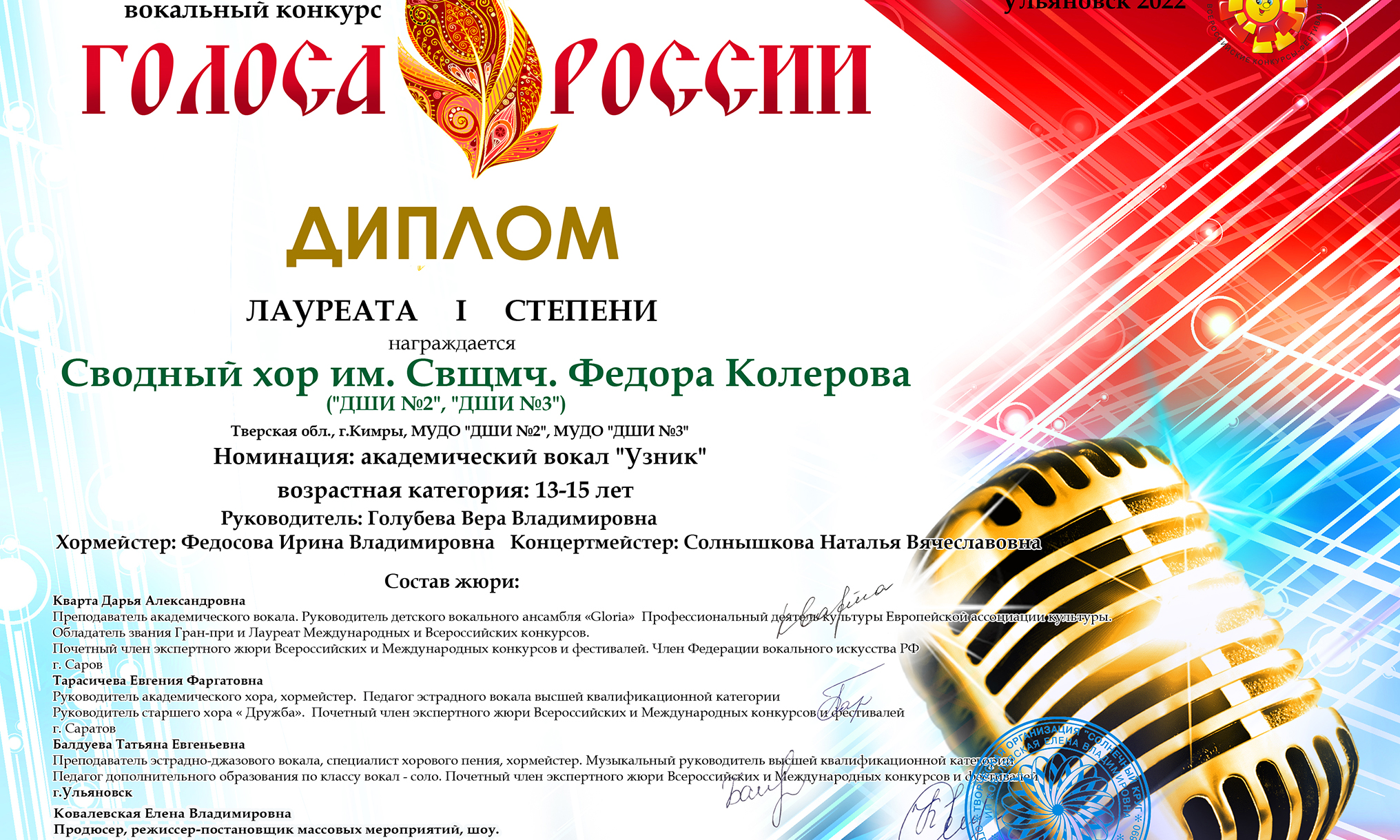 Сводный хор им. свщмч Федора Колерова в составе учащихся ДШИ №2 и ДШИ №3 (руководитель В.В. Голубева, хормейстер И.В. Федосова, концертмейстер Н.В. Солнышкова) принял участие в Международном вокальном конкурсе «Голоса России» в номинации «Академический вокал».