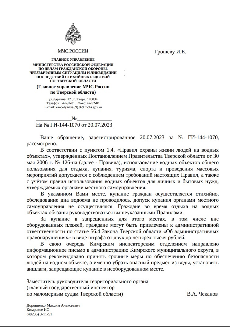 Не пора ли нашим уважаемым депутатам Законодательного Собрания Тверской области поднять вопрос на уровне правительства Тверской области с тем, чтобы в Кимрском районе к следующему купальному сезону открылись пляжи для купания? Ведь этим летом в Кимрском районе их нет. Не пора ли нашим народным избранникам подключиться к делам по укреплению авторитета власти в народной среде? Люди хотят элементарного — пользоваться своим правом проживать в безопасной и благоприятной среде, закреплённой в 42-й статье Конституции РФ.