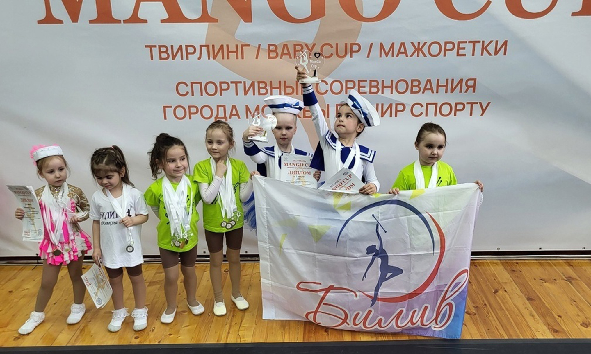 14 апреля в Москве самые маленькие спортсмены Образцового коллектива Школы-студии мажореток «Билив» с большим успехом выступили на серьезных соревнованиях по мажореткам, твирлингу и чир-спорту – «Mango cup».