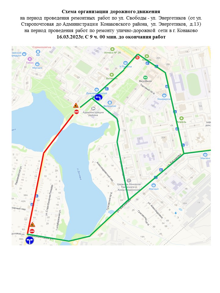 1. 16.03.2023 с 09 ч. 00 мин. ввести временное ограничение движения всех видов автотранспортных средств (кроме машин спецслужб) ул. Свободы - ул. Энергетиков (от ул. Старопочтовая до Администрации Конаковского района, ул. Энергетиков, д.13) на период проведения работ по ремонту улично-дорожной сети в г. Конаково до окончания работ.