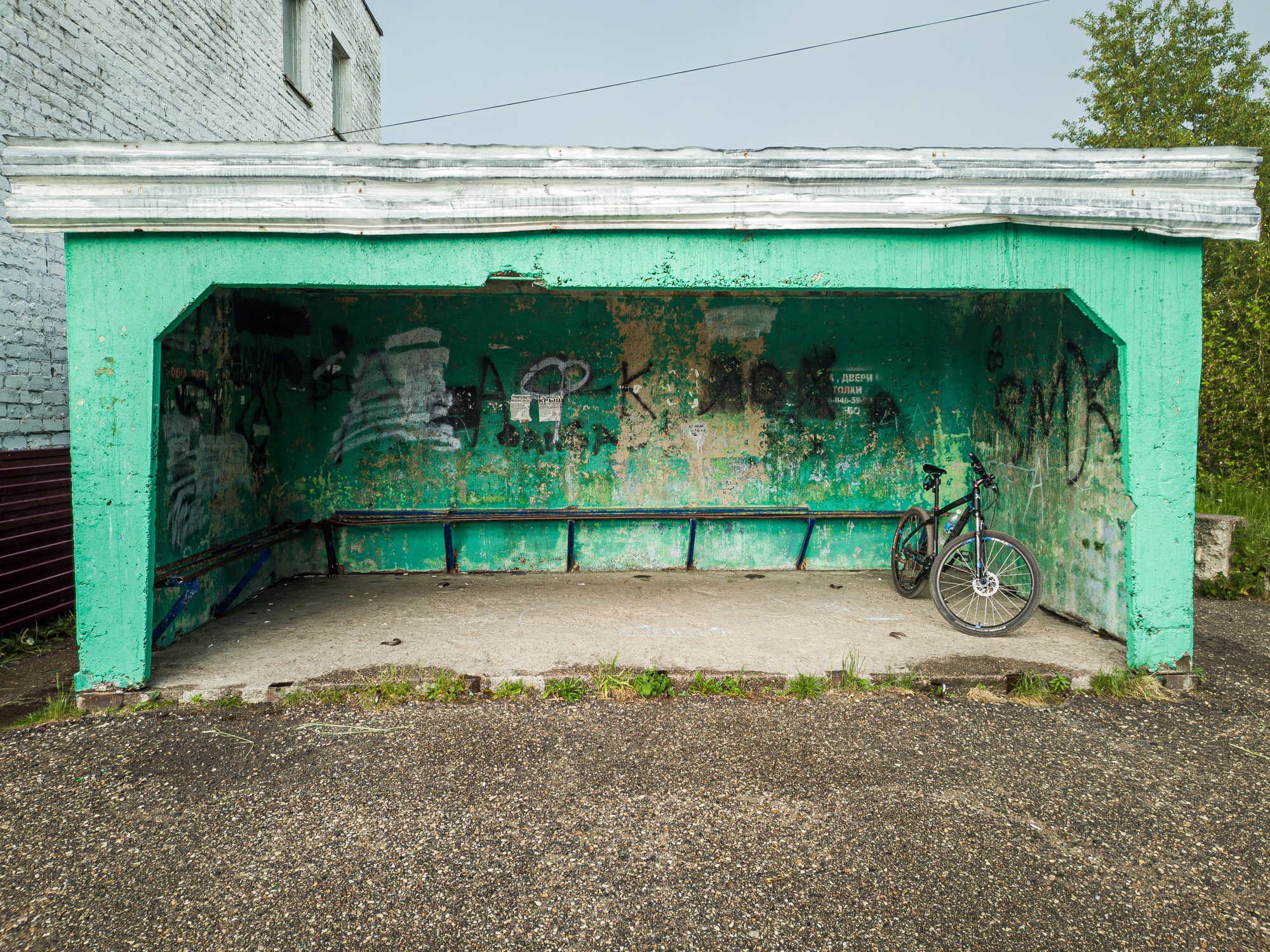 Сама автобусная остановка, видимо, досталась нам от прошлой цивилизации, сейчас так основательно не строят, железобетон. Современные автобусные остановки разваливаются от ветра. А эта выполняет свою функцию не один десяток лет и сможет защитить даже от чего посерьёзнее, чем ветер и дождь.