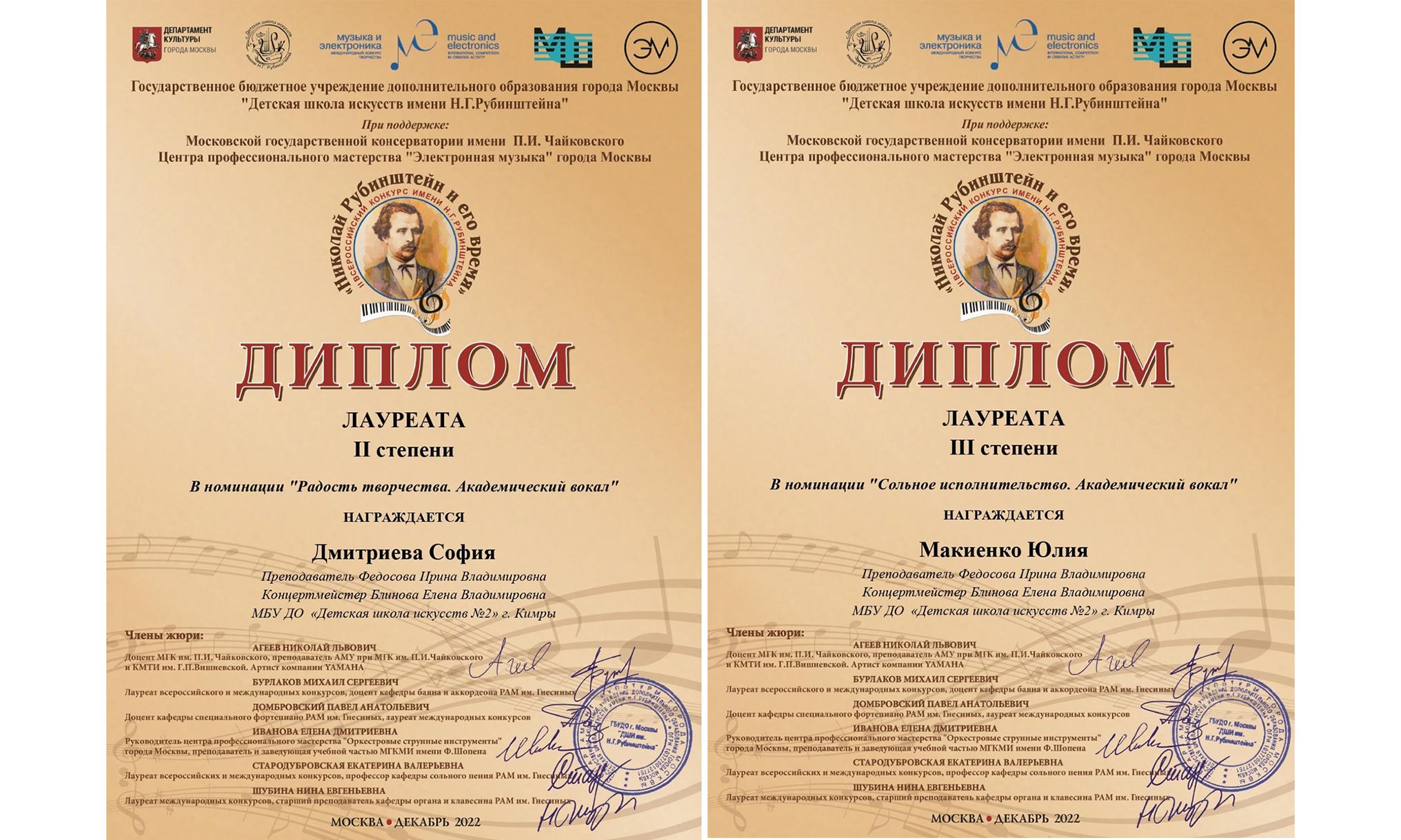 По итогам конкурса ученицы ДШИ №2 стали призерами. В номинации «Сольное исполнительство. Радость творчества» София Дмитриева – лауреат II степени; в номинации «Сольное исполнительство. Академический вокал» Юлия Макиенко – лауреат III степени (преп. И.В. Федосова, конц. Е.В. Блинова).