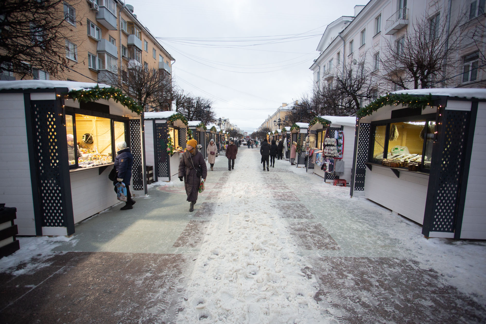На улице Трёхсвятской установлены 24 новых стилизованных домика, где представлена преимущественно продукция производителей тверского региона и новогодние сувениры.