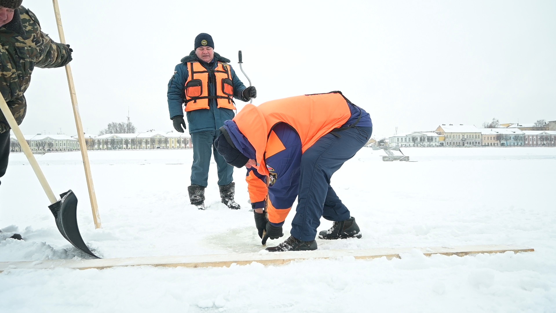 Спасатели произвели необходимые замеры толщины льда в месте установки купели. Ледяной покров возле берега достаточно крепкий – 25-35 сантиметров. На месте для купаний в настоящее время оборудуется деревянный настил с опорами, закреплёнными на дне водоема. Также для удобства купающихся на берегу реки будут смонтированы две палатки для обогрева и переодевания. Проводятся работы по монтажу дополнительного освещения.