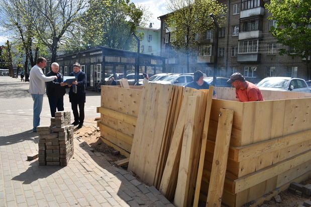 В настоящее время производится армирование опалубки чаши фонтана, после чего ее зальют бетоном, затем некоторое время нужно для того, чтобы бетон набрал крепость. Далее специалисты приступят к монтажу насосного оборудования. Работы планируется завершить до конца мая. Кроме того, на территории пешеходно-прогулочной зоны установлены скамейки и дополнительные опоры уличного освещения, уложена брусчатка, высажены пятнадцать кленов.