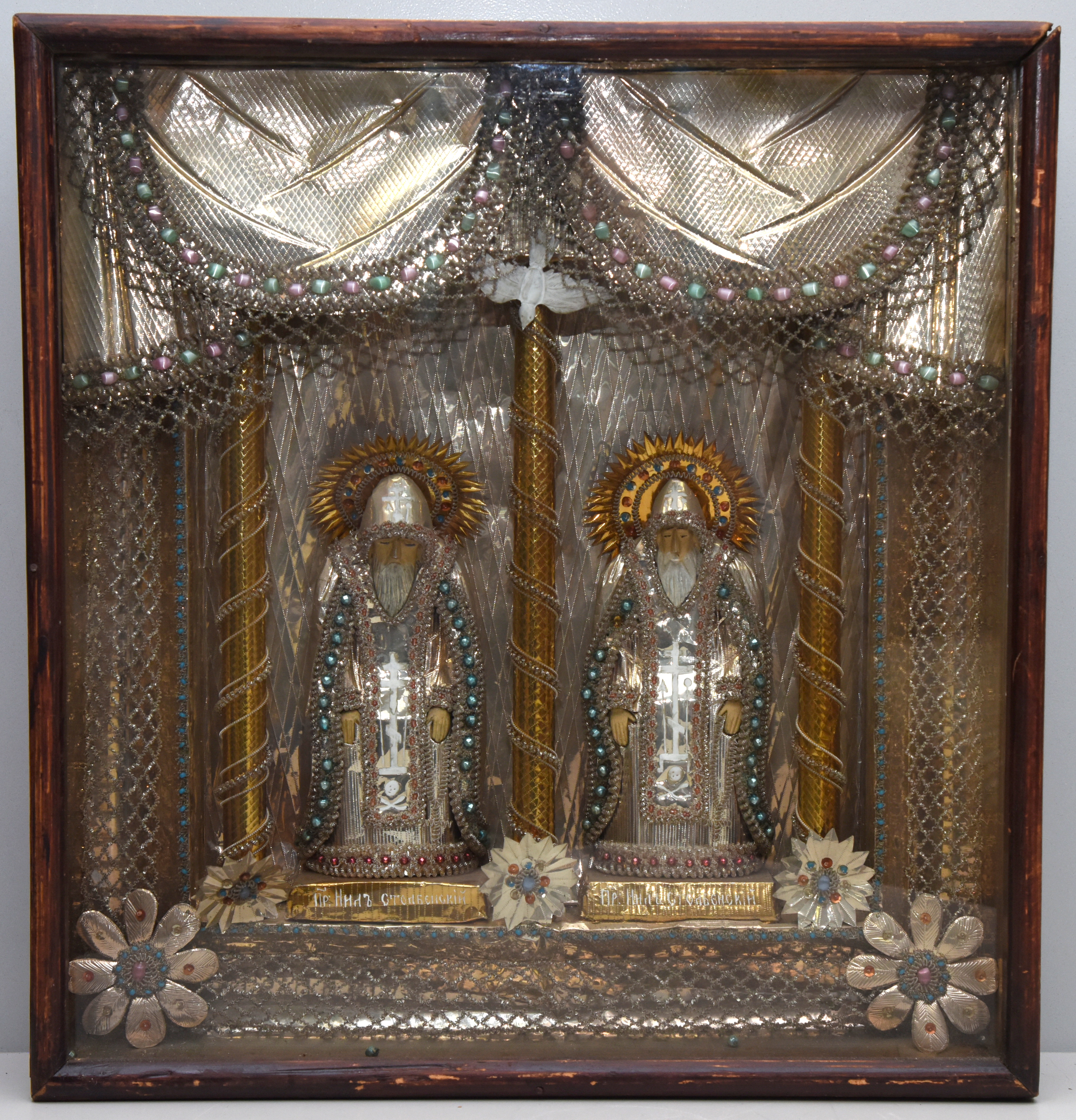 Примером последних является скульптурная композиция из собрания Тверской картинной галереи «Два Нила Столобенских», датируемая концом XIX столетия. Под застеклённым киотом помещены две фигуры преподобного Нила, облачённые в одежды из тиснёной фольги с узорами из бисера, зелёных и розовых бусин. Вокруг голов расположены объёмные нарядные нимбы из фольги золотого оттенка с узорами из проволоки и крупных разноцветных страз. Торжественность композиции усиливают колонны, обвитые спиралеобразно нитями из бисера, и занавес из тиснёной фольги с узором из стекляруса и перламутровых камней, с бахромой по краю из бисера, нанизанного на металлическую проволоку.