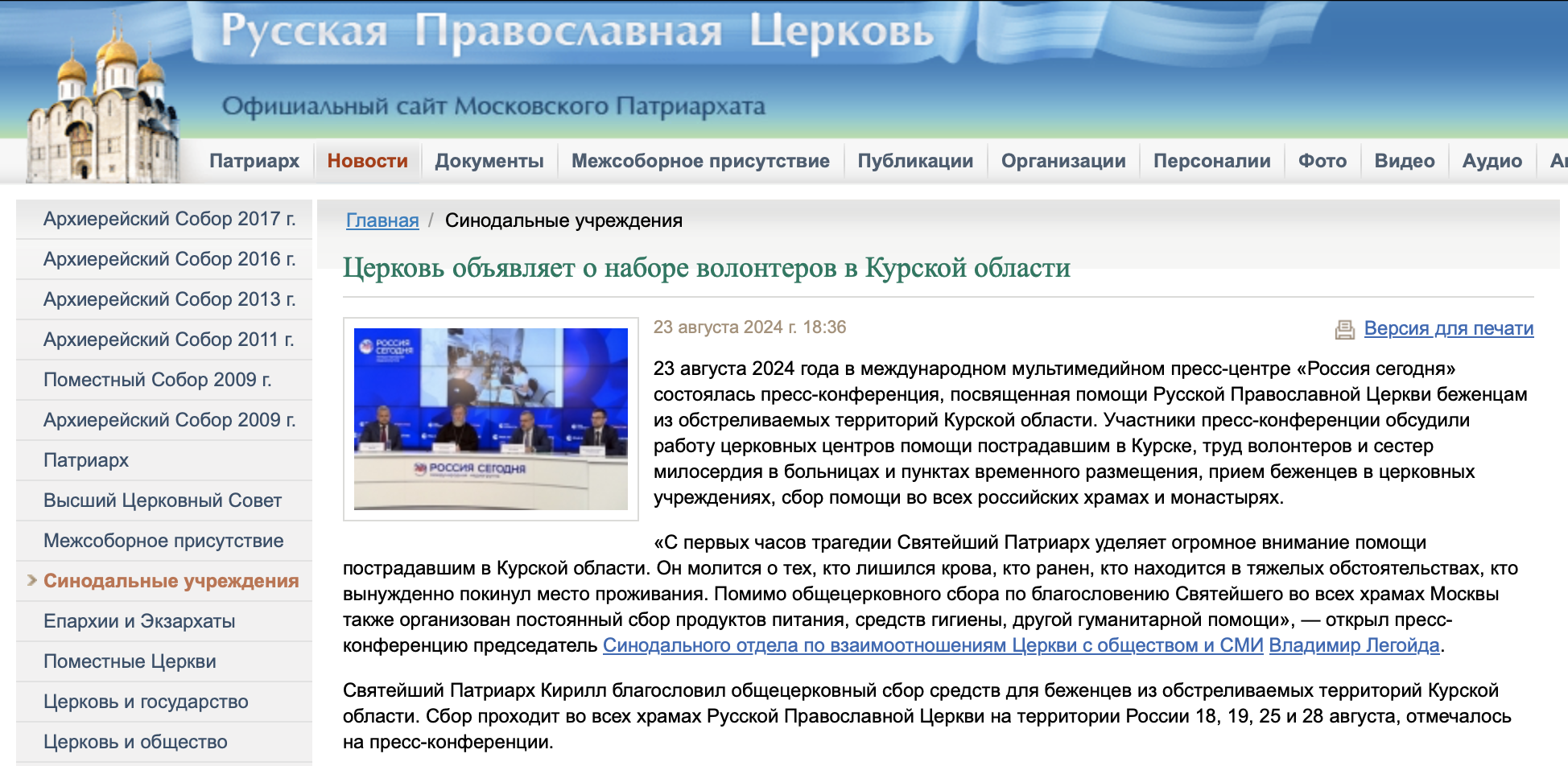 23 августа 2024 года в международном мультимедийном пресс-центре «Россия сегодня» состоялась пресс-конференция, посвященная помощи Русской Православной Церкви беженцам из обстреливаемых территорий Курской области. Участники пресс-конференции обсудили работу церковных центров помощи пострадавшим в Курске, труд волонтеров и сестер милосердия в больницах и пунктах временного размещения, прием беженцев в церковных учреждениях, сбор помощи во всех российских храмах и монастырях.