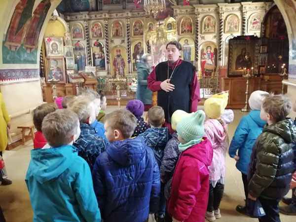 Встретил детей отец Сергий. Доступно и интересно рассказал об иконах, расположенных в стенах храма; показал, как правильно креститься; познакомил детей с историей Пасхи Христовой.