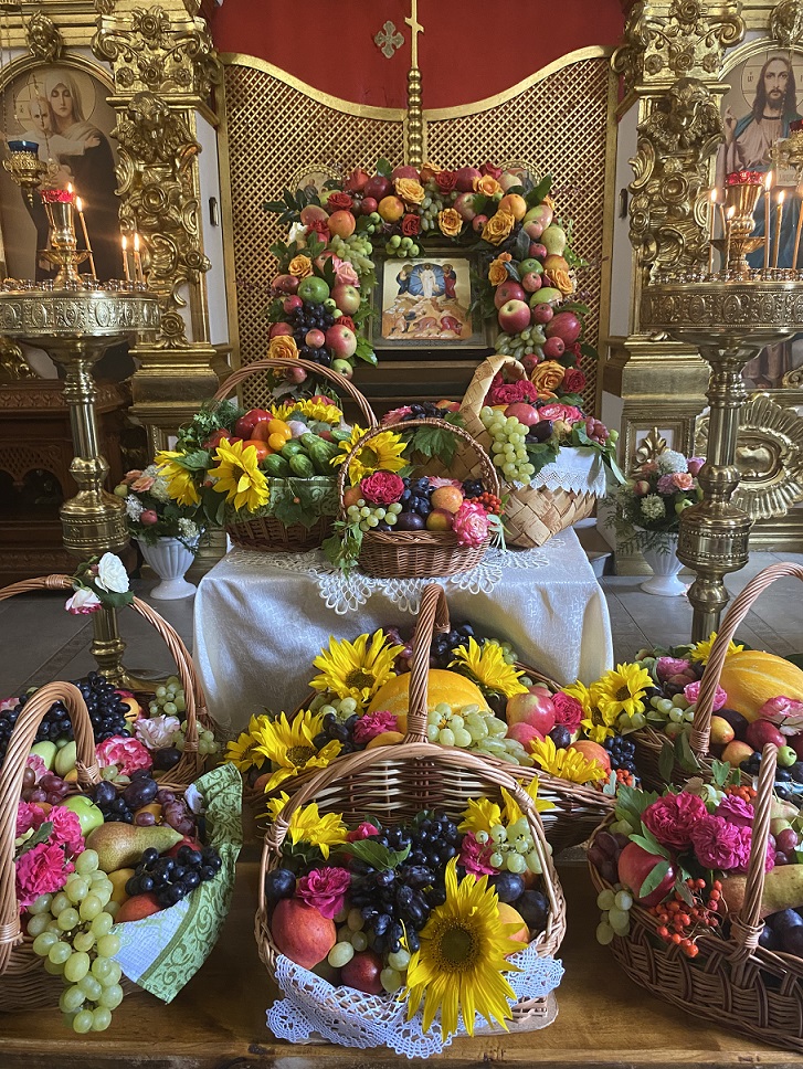 По окончании Литургии священники в белом облачении, символизирующем «фаворский свет» — таинственный Божественный свет в момент Преображения Иисуса Христа, совершили освящение плодов нового урожая и окропили их святой водой.
