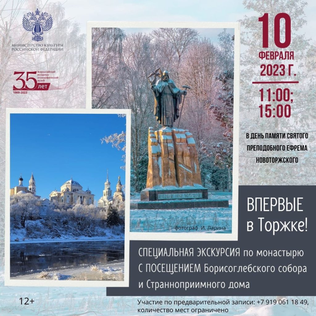 В День памяти Преподобного Ефрема Новоторжского, 10 февраля, Всероссийский историко-этнографический музей проведет бесплатную экскурсию по монастырю с посещением Борисоглебского собора авторства Н. А. Львова. Впервые можно увидеть внутреннее убранство храма, а также уникальные фрески В. Л. Боровиковского. Кроме того, знакомство с жизнью святого Ефрема Новоторжского продолжится в Странноприимном доме. Экскурсия бесплатна, но будем признательны пожертвованиям в пользу монастыря.