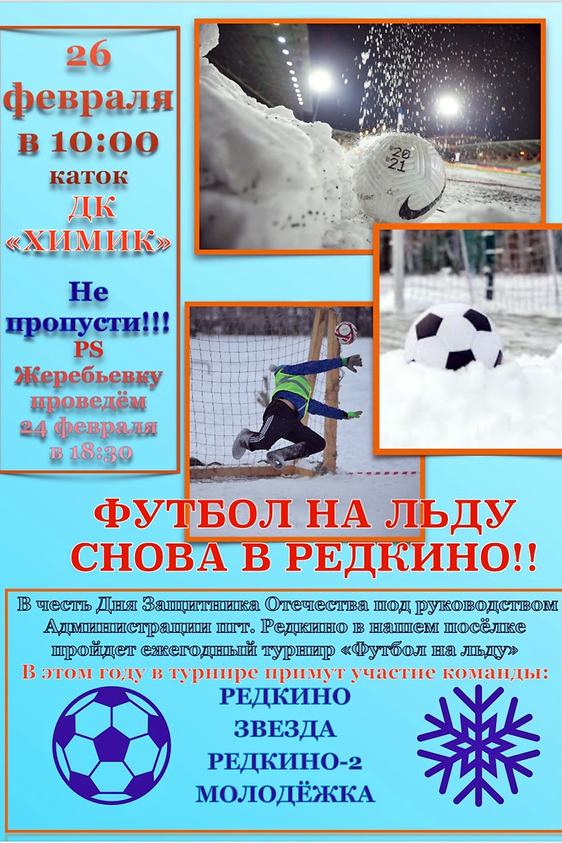 26 февраля здесь в честь Дня защитника Отечества состоится турнир «Футбол на льду» при поддержке администрации поселка. В этот раз в турнире примут участие команды «Редкино», «Звезда», «Редкино-2» и «Молодежка». Игра состоится в 10 часов утра на катке у дворца культуры «Химик». Жеребьевка будет проведена завтра, 24 февраля в 18:30.