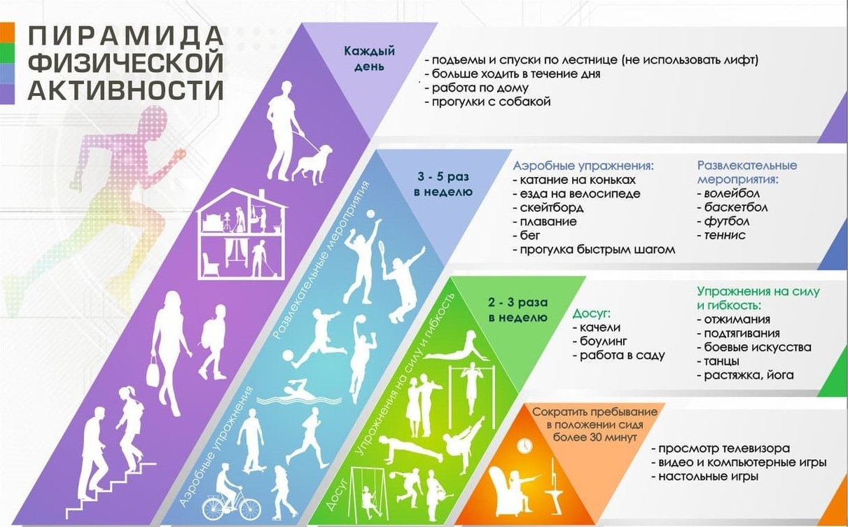 — Для получения дополнительных преимуществ для здоровья увеличить время умеренной физической активности до и более 300 минут или время интенсивной физической активности до и более 150 минут в неделю.
