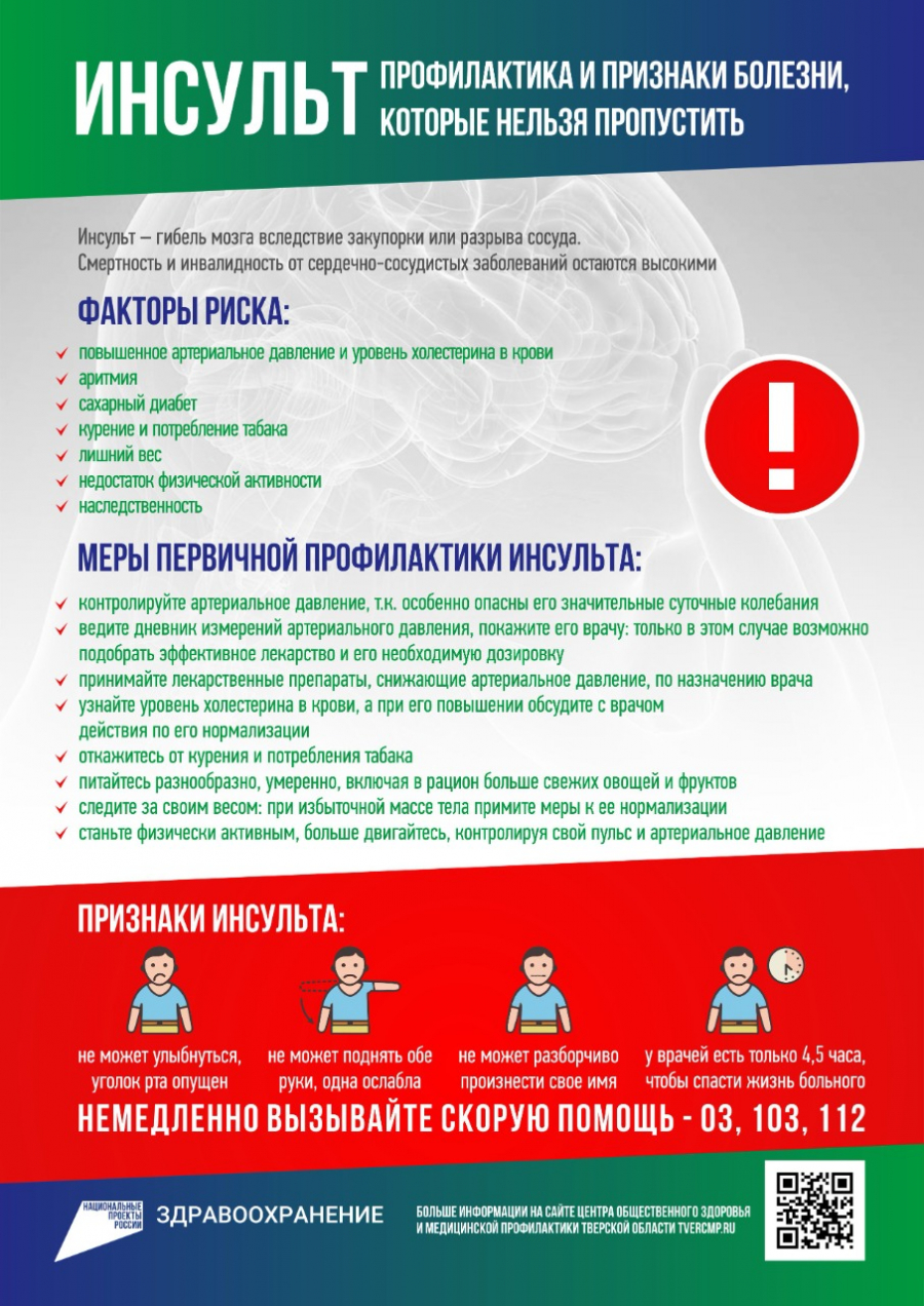 Сегодня усилия многих экспертов направлены на то, чтобы все знали первые опасные признаки инсульта. И взрослые, которые находятся в зоне риска, но что не менее важно, и дети. Если они увидят на лице у бабушки или дедушки признаки инсульта, хотелось бы чтобы они не испугались, не продолжали играть в телефоне, а воспользовались им по прямому назначению и позвонили в скорую помощь. На все это нам с вами отводится не более 2-3 часов. И тогда врачи смогут восстановить нарушенный кровоток. Чтобы лучше запомнить эти признаки, мы говорим слово «УДАР!». У - улыбка некрасивая, несимметричная, Д- движение в руке (или ноге) плохое или отсутствует, А – асимметрия лица, Р – речь нарушена. Если эти признаки (обычно все вместе, хотя что-то может быть выражено сильнее) появились внезапно - утром, днем, вечером, дома за столом, на работе, на детской площадке – немедленно вызывайте скорую.