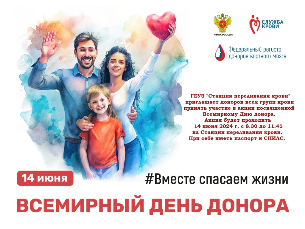 14 июня в Твери с 8:30 до 11:45 пройдет донорская акция, посвященная Всемирному дню донора: «Вместе спасаем жизнь». Место проведения – Станция переливания крови (ул. Тамары Ильиной, 20).