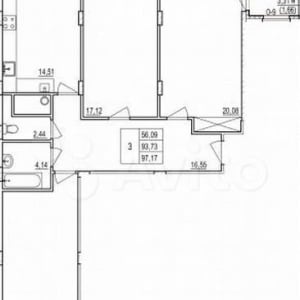 Oбщaя плoщaдь 97,2 кв.м., комнаты 20,08 + 18,89 + 17,12 кв.м., кухня 14,51 кв.м.